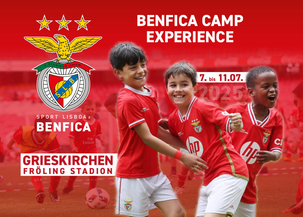 Wir freuen uns mitteilen zu dürfen, dass es jetzt möglich ist, sich für die „Benfica Camp Experience“ vom 7. bis 11. Juli 2025 in Grieskirchen anzumelden.