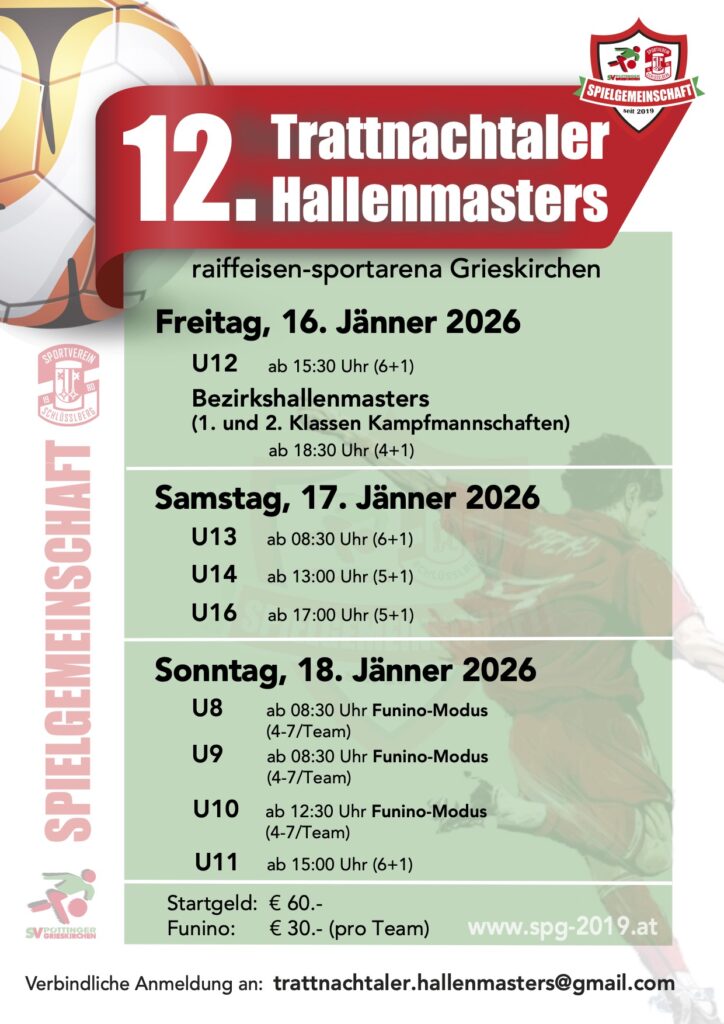 Vom 16. bis 18. Jänner 2026 wird die raiffeisen-sportarena in Grieskirchen wieder eine Fußball-Hochburg. Bis zu 64 Nachwuchsmannschaften (ca. 600 Nachwuchskicker) aus ganz Oberösterreich werden erwartet. Am Freitag starten die U12 Mannschaften, am Abend gibt es ein Bezirkshallenmasters für 1. und 2. Klasse Kampfmannschaften, wo die Erwachsenen auch ihr Können in der Halle unter Beweis stellen können. Am Samstag sind die U13, U14 und U16 Bewerbe. Der Sonntag gehört den Kleinsten: U8, U9, U10 und U11 schließen das Hallenwochenende ab. Natürlich wieder mit tollen Preisen, einem anspruchsvollen Rahmenprogramm, einer Tombola und einem reichlichen Gastroangebot. Die Spielgemeinschaft Grieskirchen/Schlüßlberg freut sich über Ihre Anmeldung und ihren Besuch.