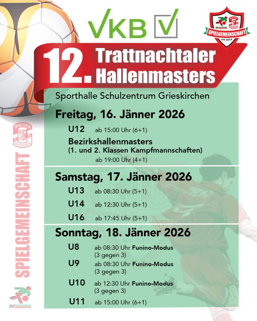Vom 16. bis 18. Jänner 2026 wird die Sporthalle in Grieskirchen wieder eine Fußball-Hochburg. Bis zu 64 Nachwuchsmannschaften (ca. 600 Nachwuchskicker) aus ganz Oberösterreich werden erwartet. Am Freitag starten die U12 Mannschaften, am Abend gibt es ein Bezirkshallenmasters für 1. und 2. Klasse Kampfmannschaften, wo die Erwachsenen auch ihr Können in der Halle unter Beweis stellen können. Am Samstag sind die U13, U14 und U16 Bewerbe. Der Sonntag gehört den Kleinsten: U8, U9, U10 und U11 schließen das Hallenwochenende ab. Natürlich wieder mit tollen Preisen, einem anspruchsvollen Rahmenprogramm, einer Tombola und einem reichlichen Gastroangebot. Die Spielgemeinschaft Grieskirchen/Schlüßlberg freut sich über Ihre Anmeldung und ihren Besuch.